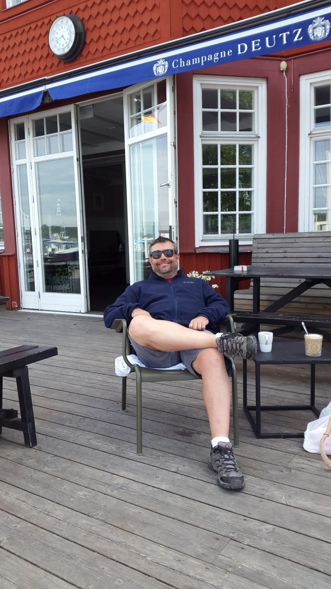 Efter vårt lilla dopp så satte vi oss på hotellets veranda med varsin kaffe och tittade på båtar och folk.