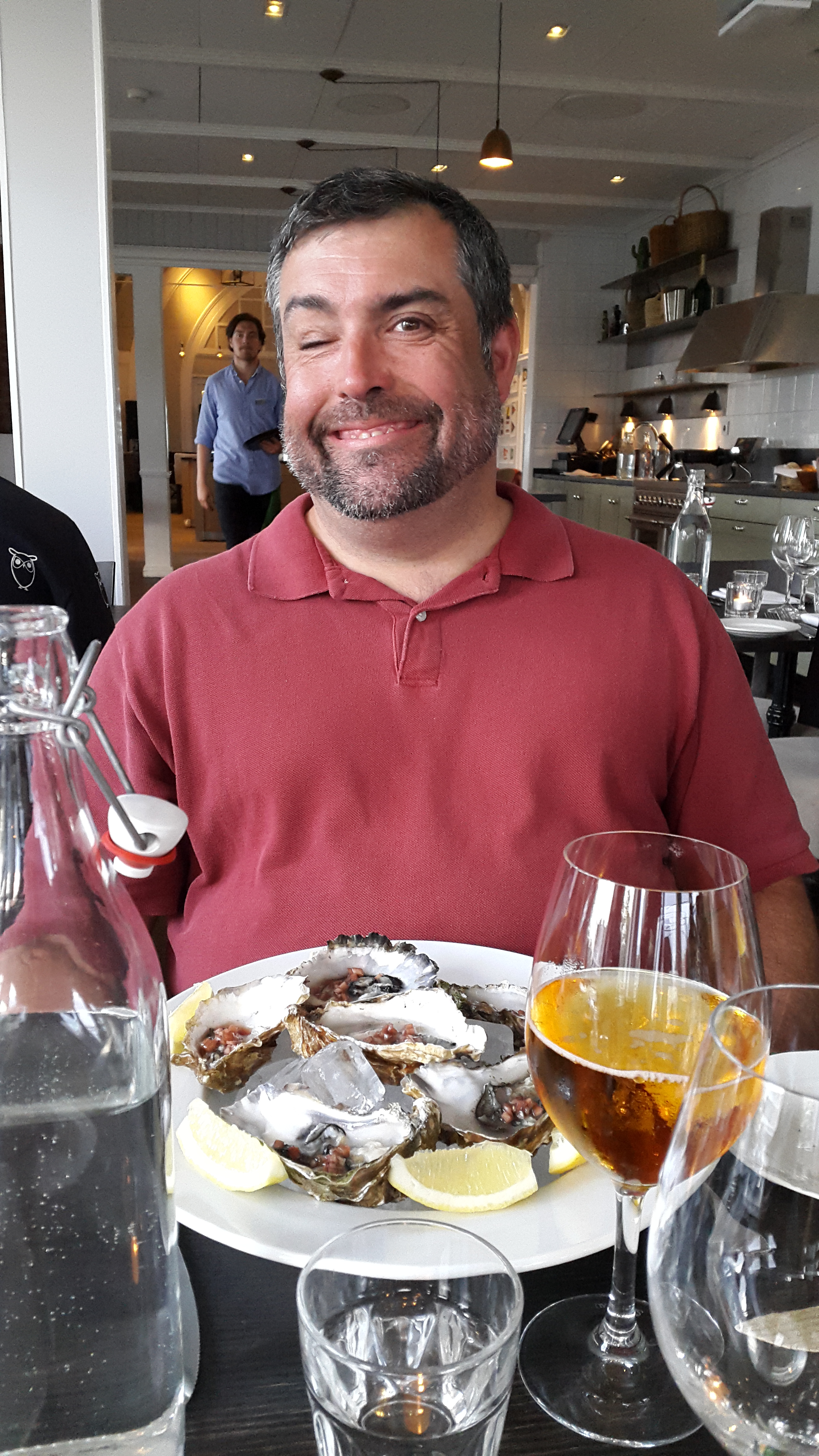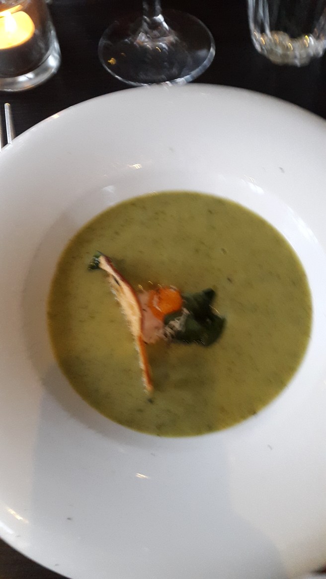 Jim hade ostron med jordgubbsvinigrette (!) till förätit. Sen åt han röding och jag en ramslöksoppa med kyckling. Mmmm!
