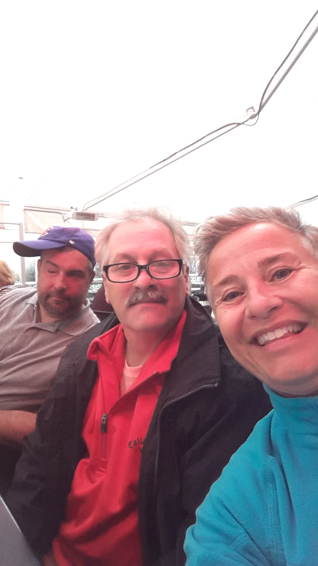 Mick, John and Dana. Vi satt och njöt i solen men sen började det regna. Så på båtresan till stan satt vi inne.