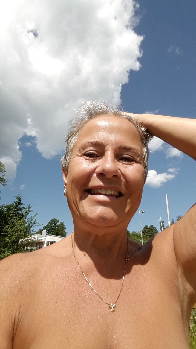 Vaknar vid 9 och kikar ut. Himlen är alldeles klarblå och solen skiner! ! Yippieee! Så jag packar matsäck och åker till stranden där jag träffar Carina, Nathalie och småkillarna.