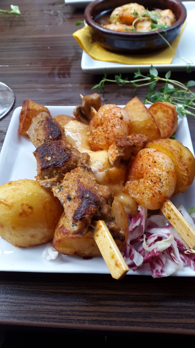 1 spett med fläskfilé, 1 spett med räkor och svamp och så potatis och aioli. SÅ gott!!!