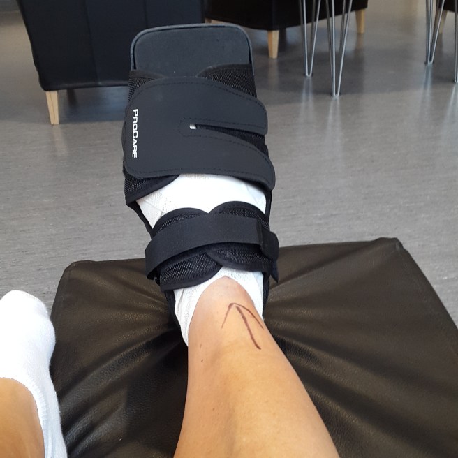 Och så ritade de på mig. Sen kom läkaren och satte bedövningen. Jag är inte alls spruträdd men fasen.  En nerv skulle bedövas, och när hon stack mig under fotknölen så gjorde det ont ner under hela foten ut i ”långtån”. Jag blev så paff att jag skrek till! Men det gick bra!