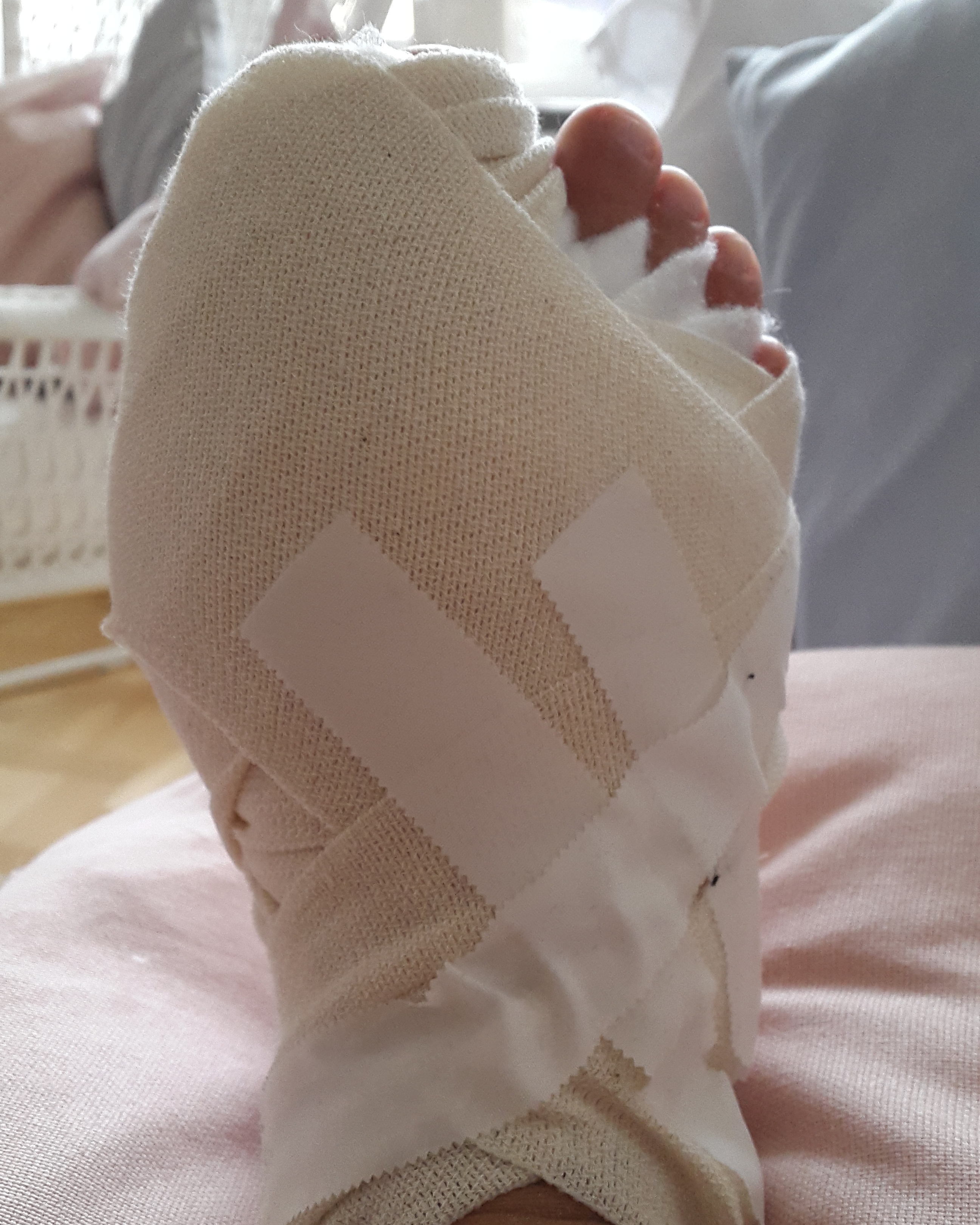 Sedan fick jag gå på den bedövade foten i i operationssalen. Märklig känsla! Jag fick ha med mig mobilen med headset så jag kunde lyssna på musik när de sågade i benen och borrade. Och så hade jag med min bok, men den hade jag hunnit läsa ut medan de förberedde. Det gjorde absolut inte ont, men en mycket märklig känsla när de rotar runt i foten och sågar av ben.