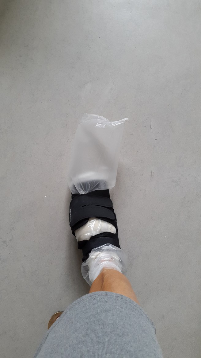 Jag satt på en köksstol och drog på mig plaststrumpan. Sen kom jag på att jag ju måste ha snyggskon när jag går, så jag tog på den utanpå.