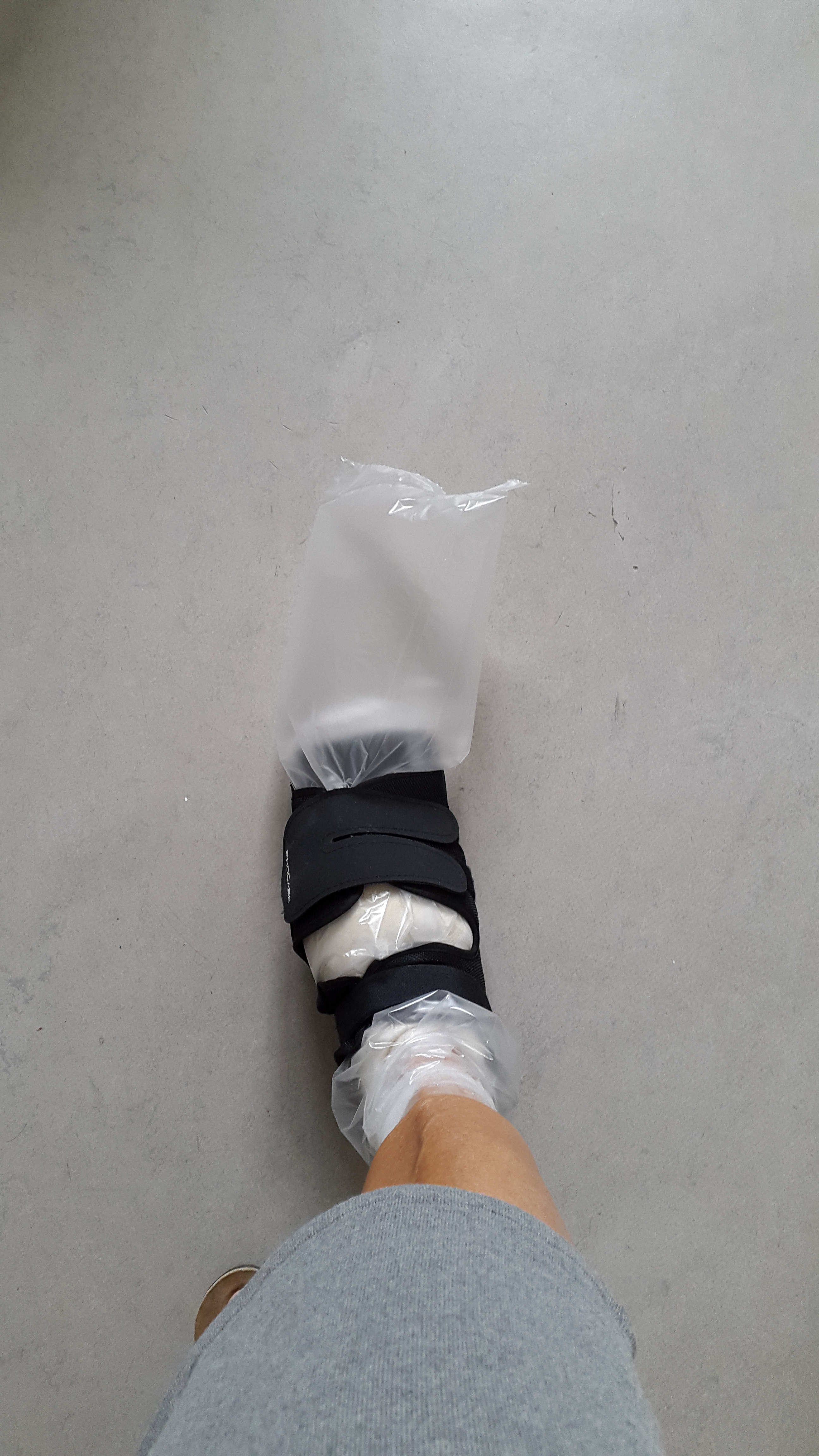 Jag satt på en köksstol och drog på mig plaststrumpan. Sen kom jag på att jag ju måste ha snyggskon när jag går, så jag tog på den utanpå.