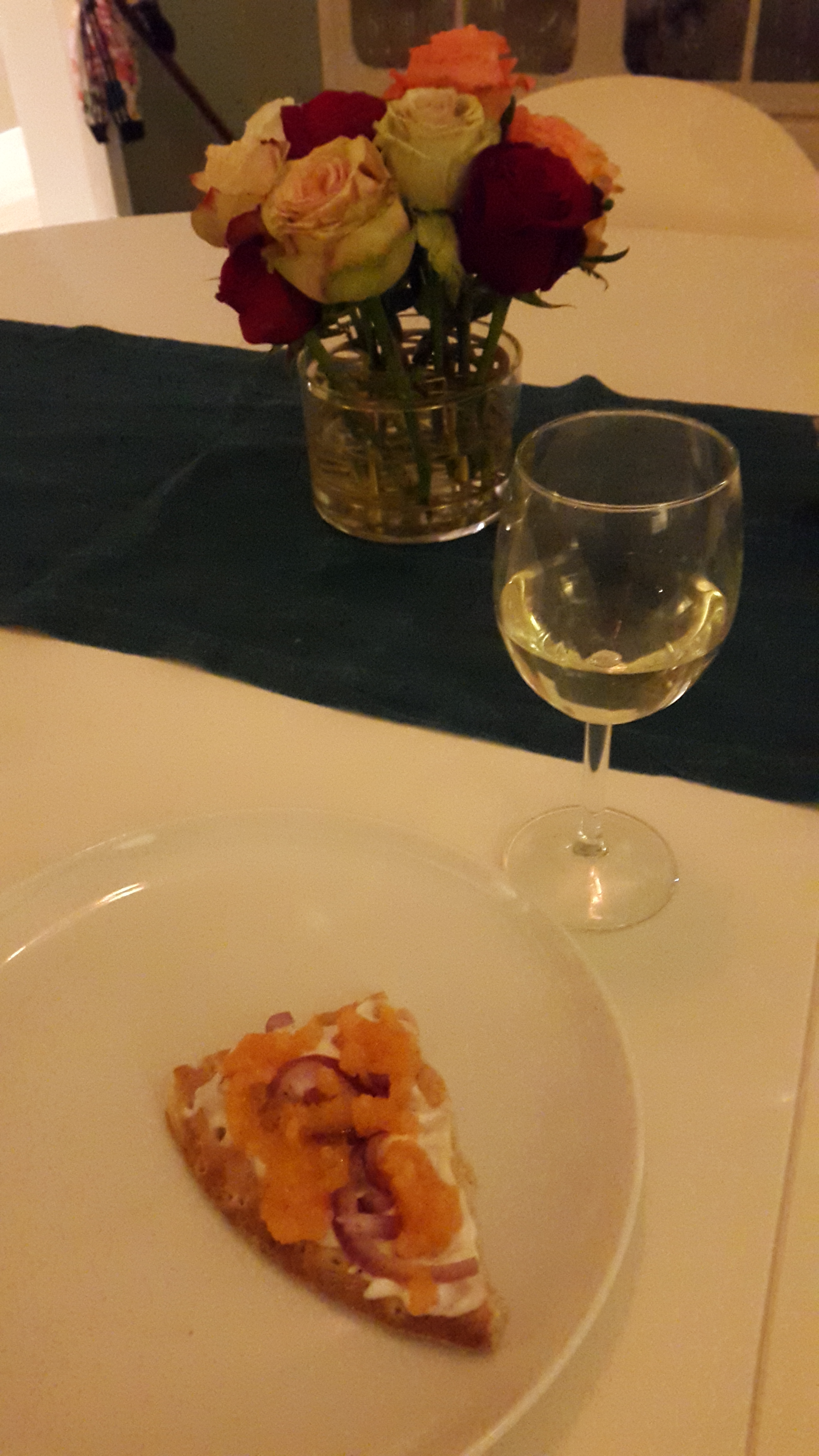 Efter att jag duschat drog jag på mig myskläderna och åkte hem till Anita. Vi hade mysfredag! Hon bjöd på löjrom, räkor och vitt vin.