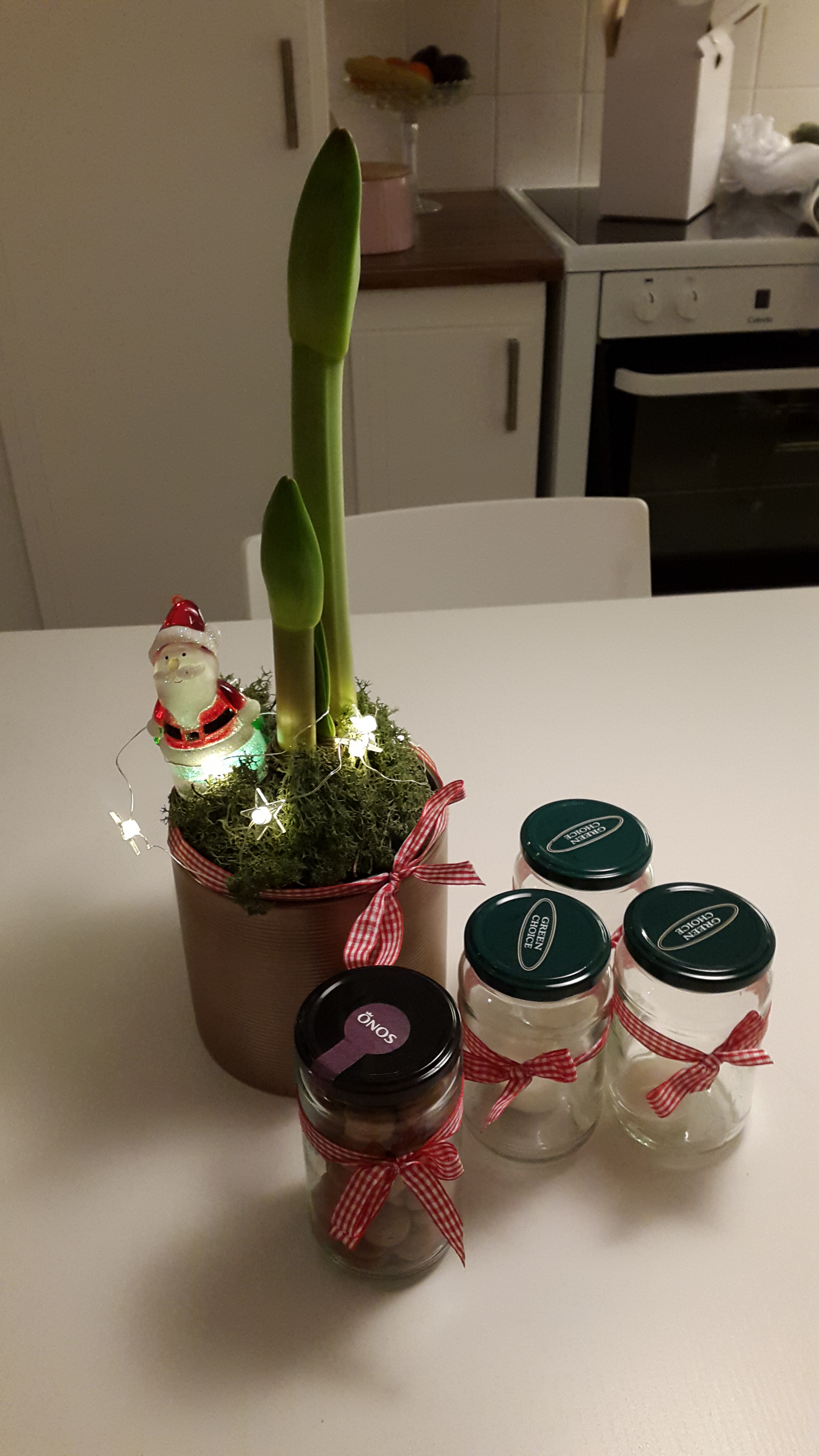 Hon vill ha glasburkar för att ha torkad svamp i. Så nu satte jag värmeljus i några och julsnöre runt. Och så pepparnötter i 1 burk. Och en amaryllis som jag pimpat lite! Det blir nog bra. Det är tanken som räknas. Och tänkt har jag… 🎅