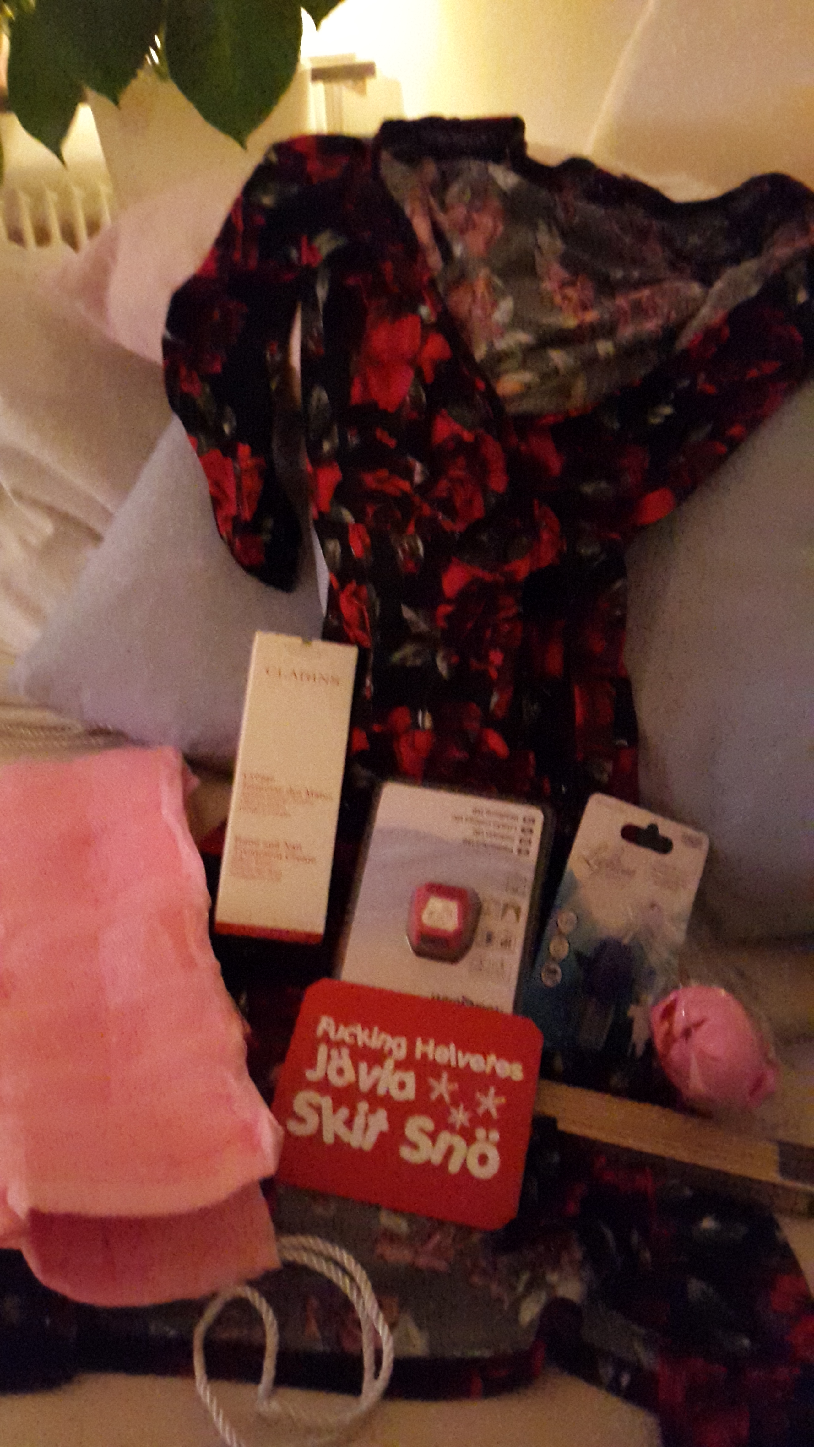 En jättefin klänning,  en tvättlapp som man tvättar ryggen med, en isskrapa med passande text på, en handkräm från Clarins,  en pannlampa, en liten lampa som man hänger på jackan eller väskan i stället för reflex och så en liten pryl som man sätter på fingrarna när man målar naglarna och har nagellacksflaskan i. Och sist, men unte minst: en tumstock!! Hon vet vad jag behöver! En massa fina och kul grejer!!! Min fina M, kommer alltid på så fina och bra presenter! Jag skäms lite, jag är inte lika bra på det som hon!