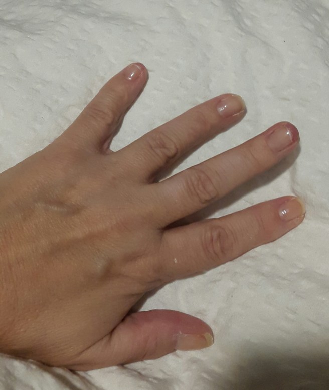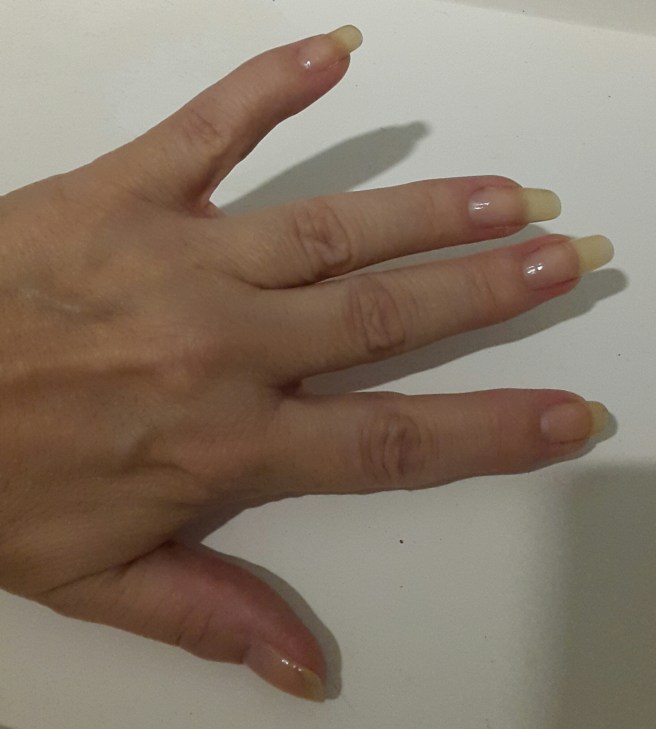 Så då klippte jag av allihop. Och då gick lillfingernageln på samma hand oxå av längst ner.