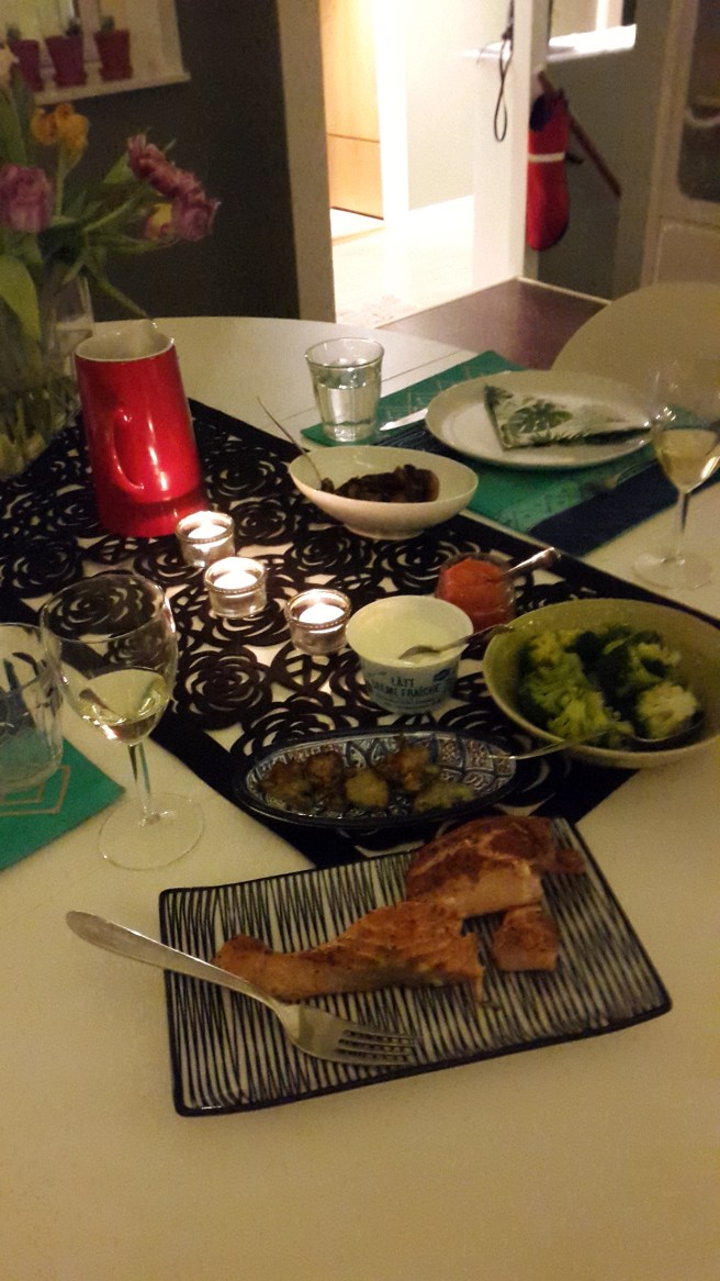 Anita och jag åt god lax med grönsaker igår. Och drack varsitt gott glas vin till!