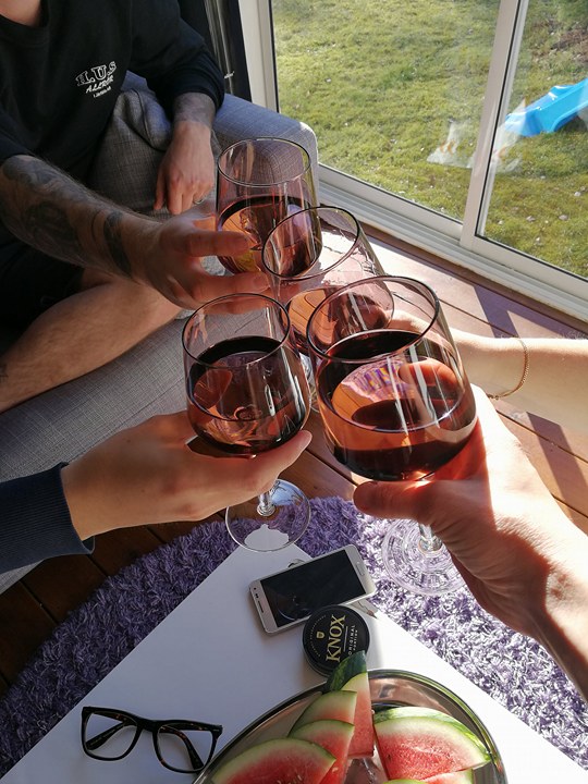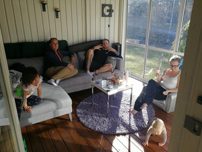 Sen när mamman och pappan och även Orreborre, Amina och Dennis kommit så grillade Toyboy kyckling, haloumi och grönsaker. Och vi satt i pensionärskuvösen och drack rosévin.