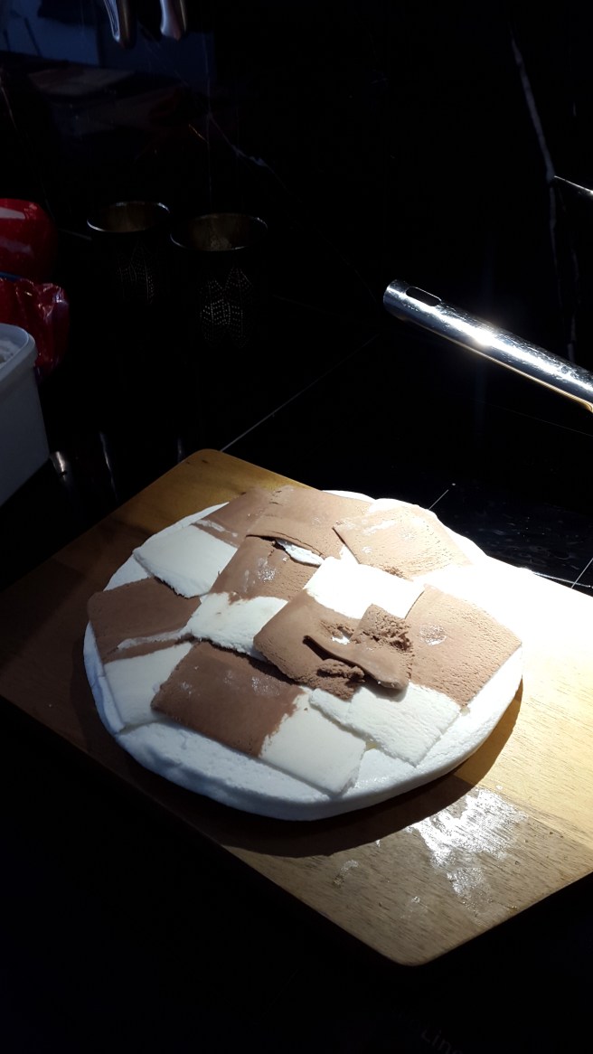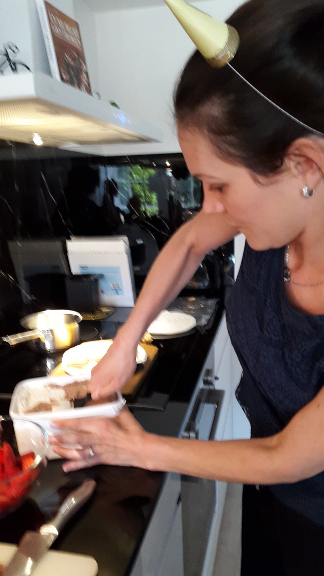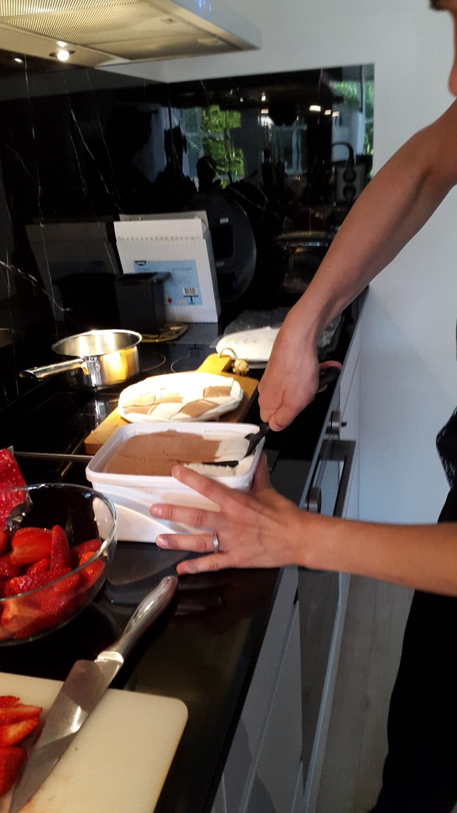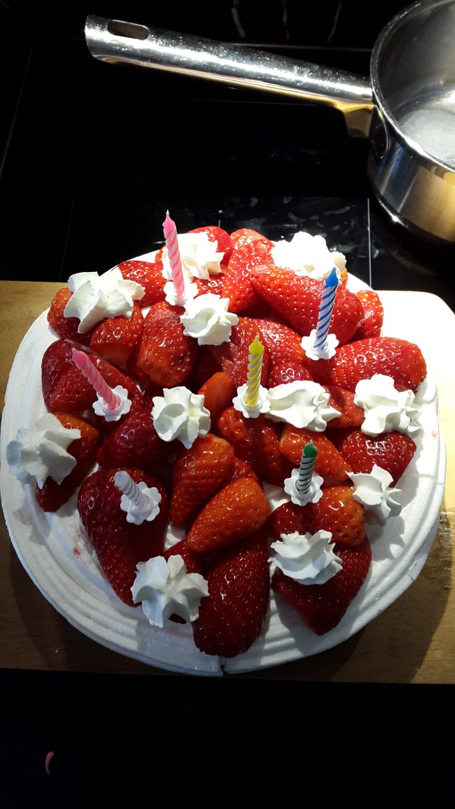 Nettis gjorde tårta på marängbottnar med glass och jordgubbar.