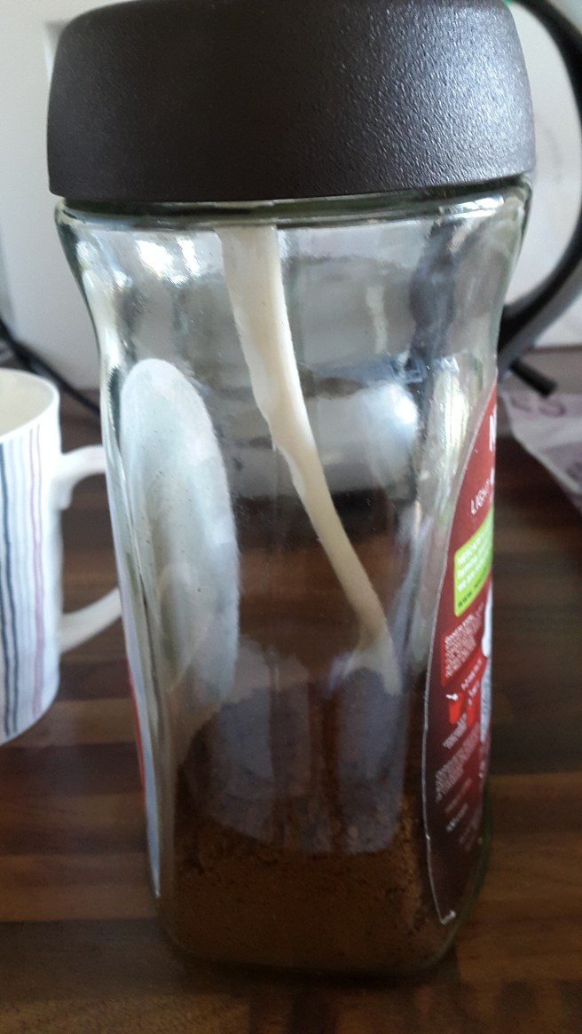 I min burk med pulverkaffe brukar jag ha en tesked. Och när det börjar bli lite kaffe kvar så når jag knappt att fiska upp skeden, och sen knappt att få upp kaffe. Jag köpte en lång sked,men den var så klart för lång.