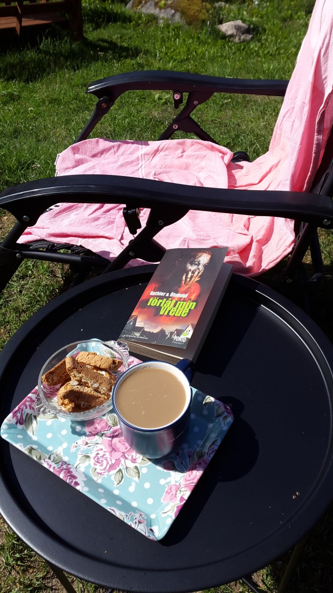 Jag har varit i plurret och tvättat mig nyss och nu sitter jag i skuggan av en stor björk. Om jag tyckte det var mycket björkfnuttar hemma så var det ingenting! Hela luften är full av dem, och de är Ö V E R A L L L T! I köket, sängen,kaffekoppen….