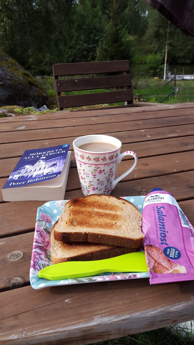 Det var helt grått på himlen när jag gick upp. Men det var ändå ganska skönt, så jag tog med frukosten ut.