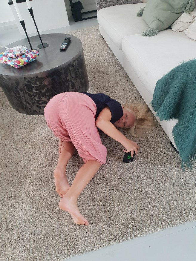 Storpudding har en egen stil när hon kollar på sin padda. Minst sagt…