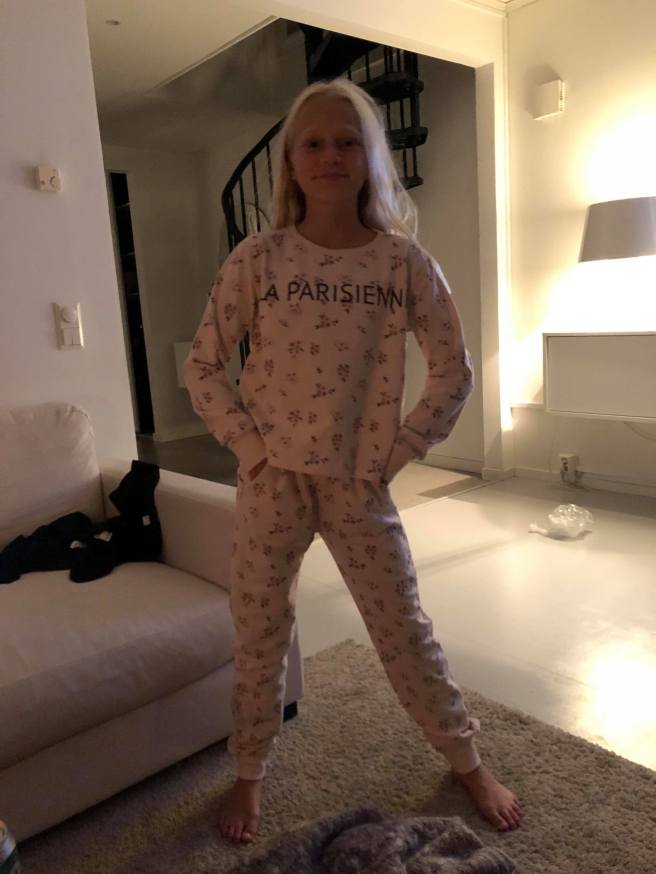 Hon gillade sin tröja och byxor som jag köpt!! Kul!