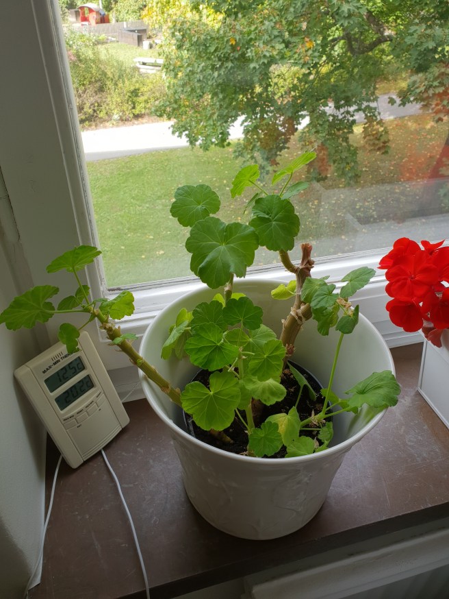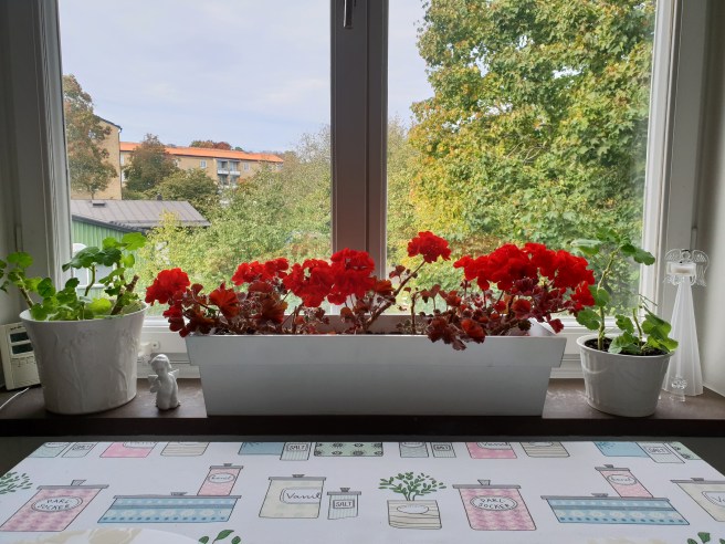 Och sÄ tog jag in balkonglÄdan med pelargoner. Det Àr vÀl snart frost nattetid.