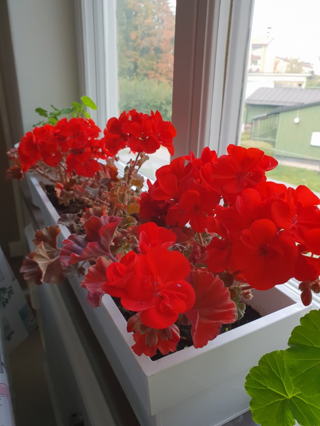 För det mesta brukar mina balkongblommor bli kvar på balkongen tills de frusit ihjäl. Så jag tycker jag var riktigt duktig som såg till att ta in dem i tid i år! Hade först tänkt att ta upp dem och plantera dem i varsina krukor, men så insåg jag att de kan ju lika gärna vara kvar i balkonglådan.