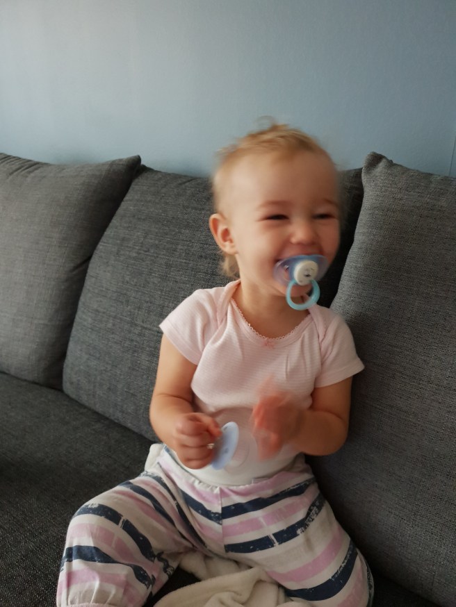 Vaknar och är glad på en gång! Gladare barn får man leta efter.