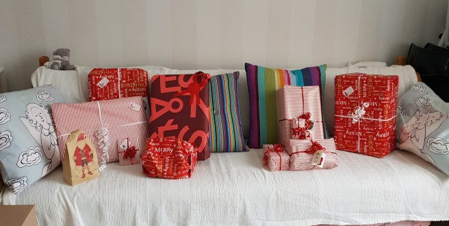 La alla färdiginslagna paket i soffan i lillarummet. Det är så fint när de ligger en massa fina paket där.