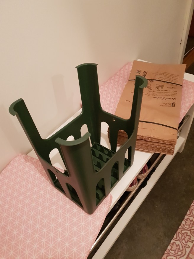 Både påsar och en hållare till påsen. Superbra! Hållaren ser ut som en uppochnedvänd pall. Fniss!