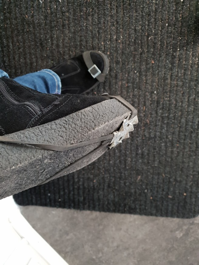 Eftersom det var ett äventyr bara att ta mig till soptunnan och sen till Curves (som alltså ligger på gården bredvid där jag bor!) på morgonen så bestämde jag att broddar, det får det bli! Rotade runt hemma, för jag vet att jag köpte det nån gång. Kan ha varit efter att jag bröt lårbenet. Och jag hittade dem!