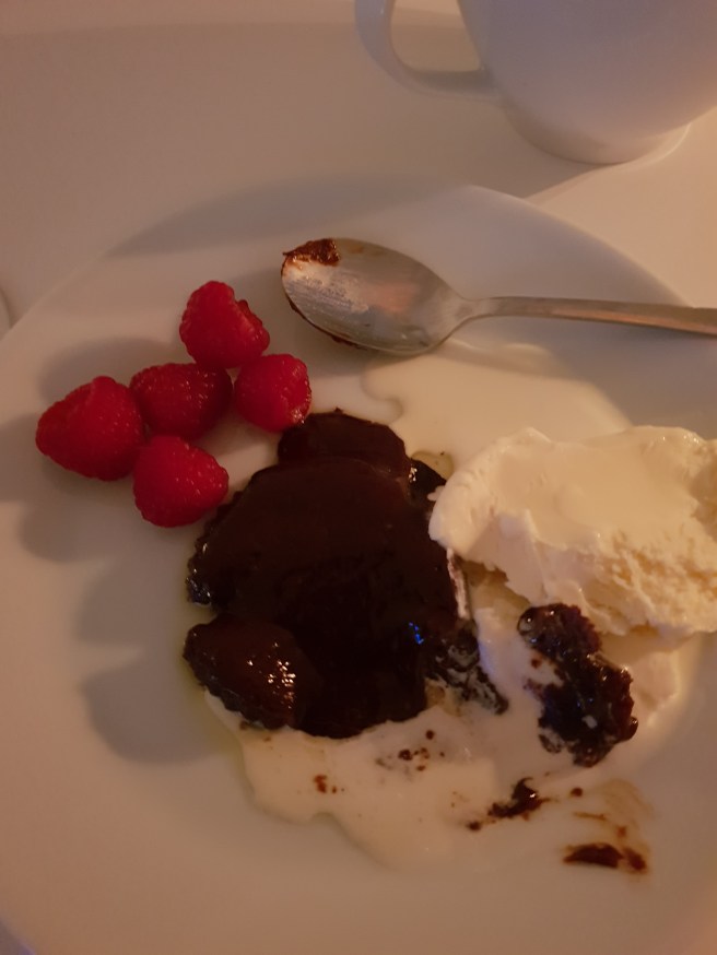 Chokladfondant, vaniljglass och hallon. Jag hade kunnat slicka tallriken ren. Mmmmm!!