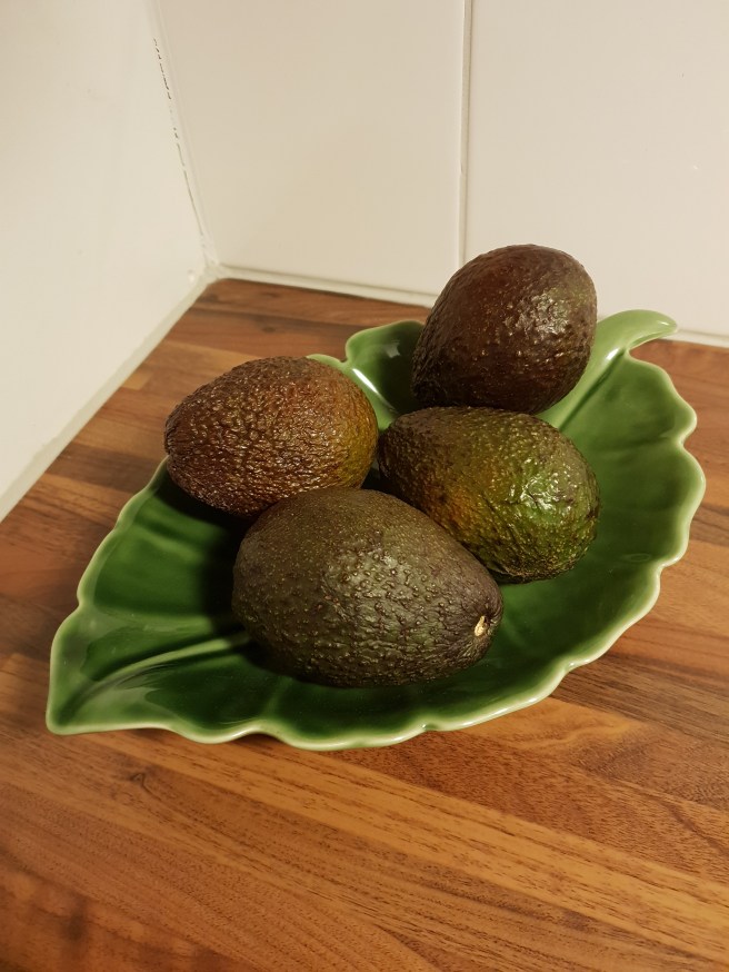Jag skulle köpa bröd på vägen hem igår. Får syn på att de har fina avokado, så haffar ett par såna oxå. Kommer hem och lägger dem i skålen.