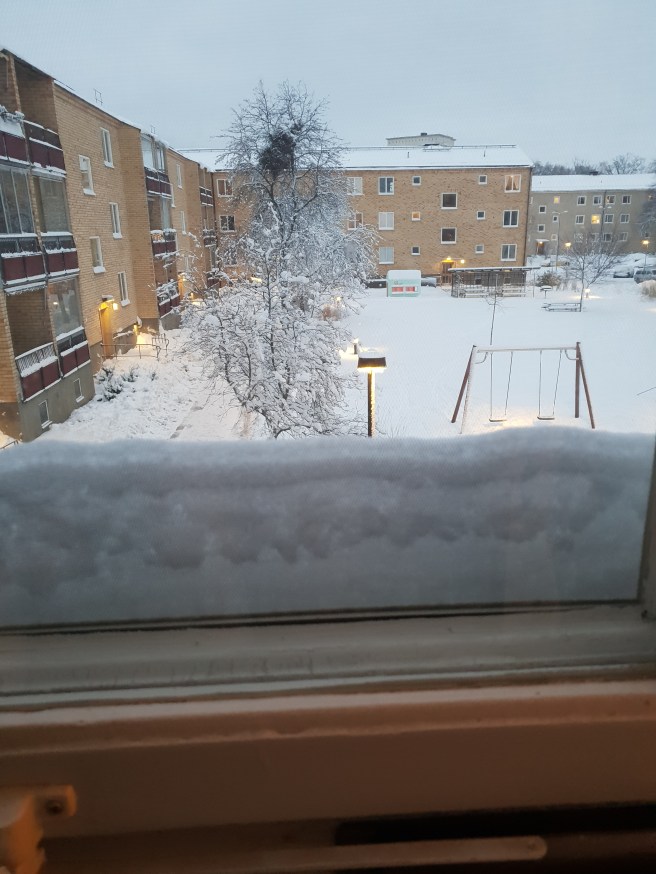 Då var det plötsligt barndom för mig. Doften av äppelpannkaka, som mamma gjorde av äpplen vi fick av hennes faster som hade äppelträd. Och så snön mot fönstret. Av nån anledning var det verkligen barndom. Försökte komma på varför snön mot fönstret kändes så, men vet inte riktigt. Det ända jag kom ihåg, som jag inte tänkt på sen jag var barn tror jag, var att till jul la mamma bomull mellan fönstren och satte små tomtar och flugsvampar i. Det var jättefint!