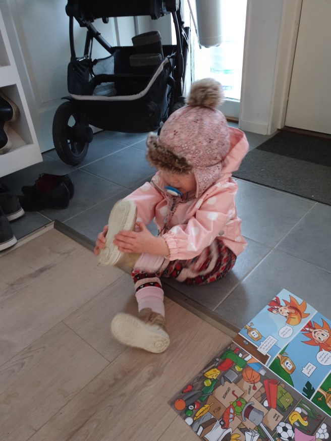 Hon hade fått en ny jacka igår, och hon älskar att få kläder. Plötsligt fick jag syn på henne i hallen. Hon har tagit på sig alla ytterkläder, och till och med lyckats få på skorna på rätt fot! Sen kom hon och hämtade mig, tog mig i handen och drog mig uppfordrande till ytterdörren. Så det var bara att dra på sig paltorna och gå ett varv. Vi tog med soporna och gick med dem.