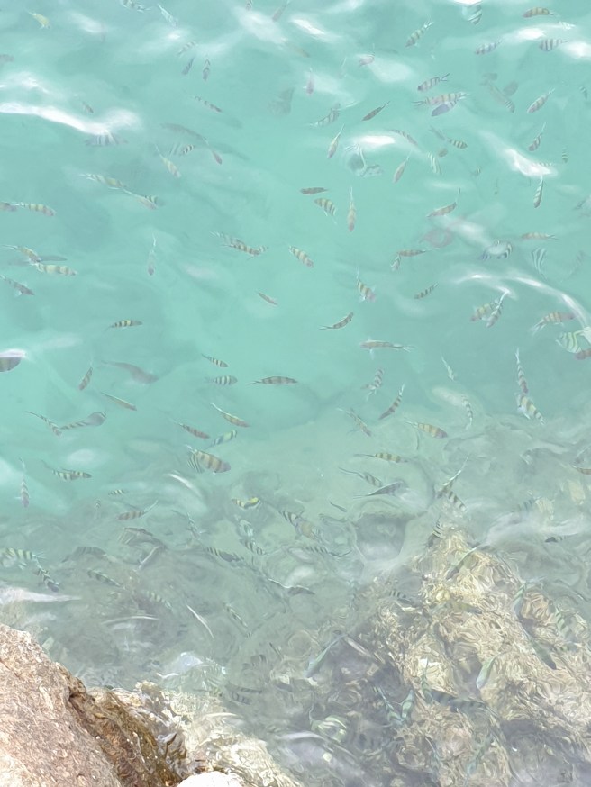 -Säg till när du ska fota så jag kan dra in magen, säger Bror. Hahaha!Nedanför klippan var det massor av fisk!