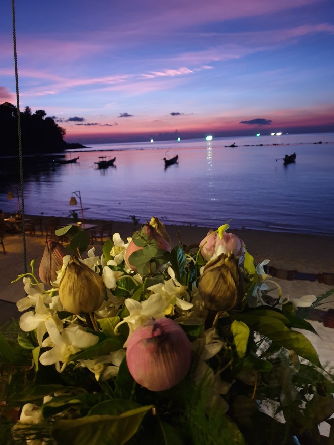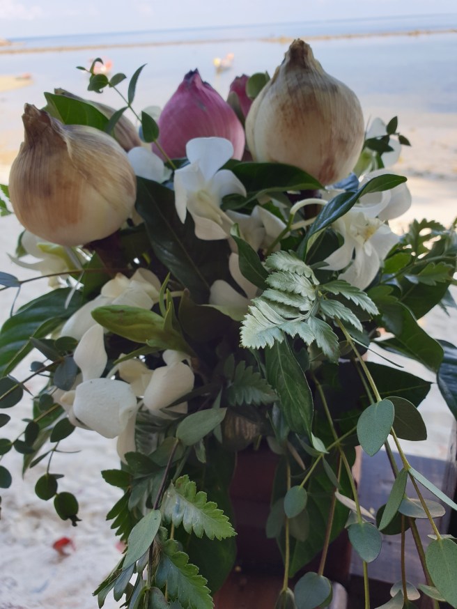 De fina blomsterdekorationerna med Lotusblommor ställde de ut i restaurangen dagen efter.