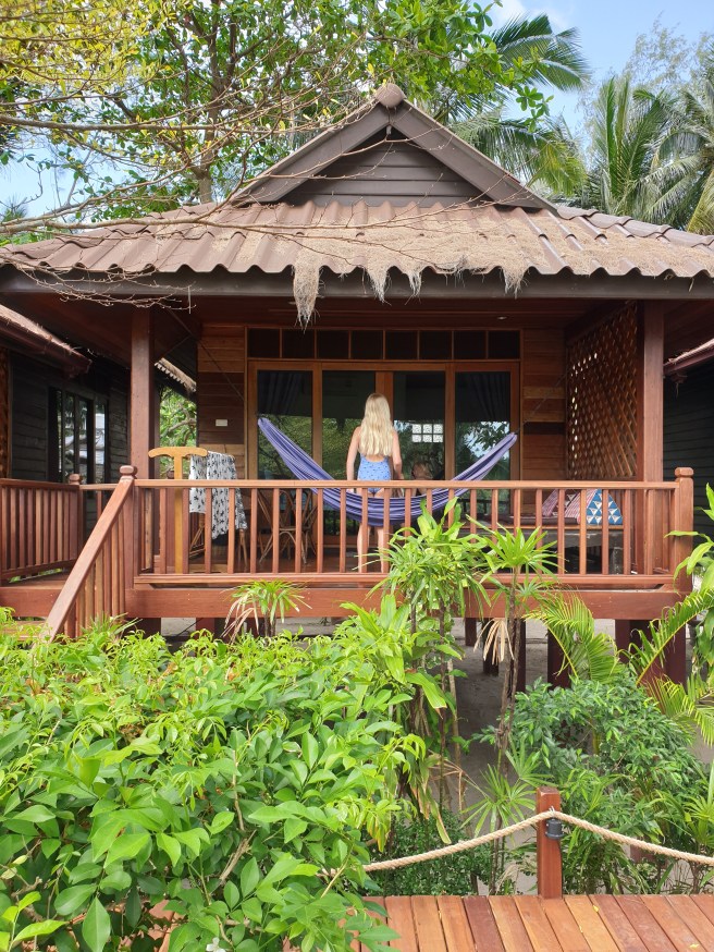 Min altan, med både stolar, bord, hängmatta och en plattform med kuddar på.