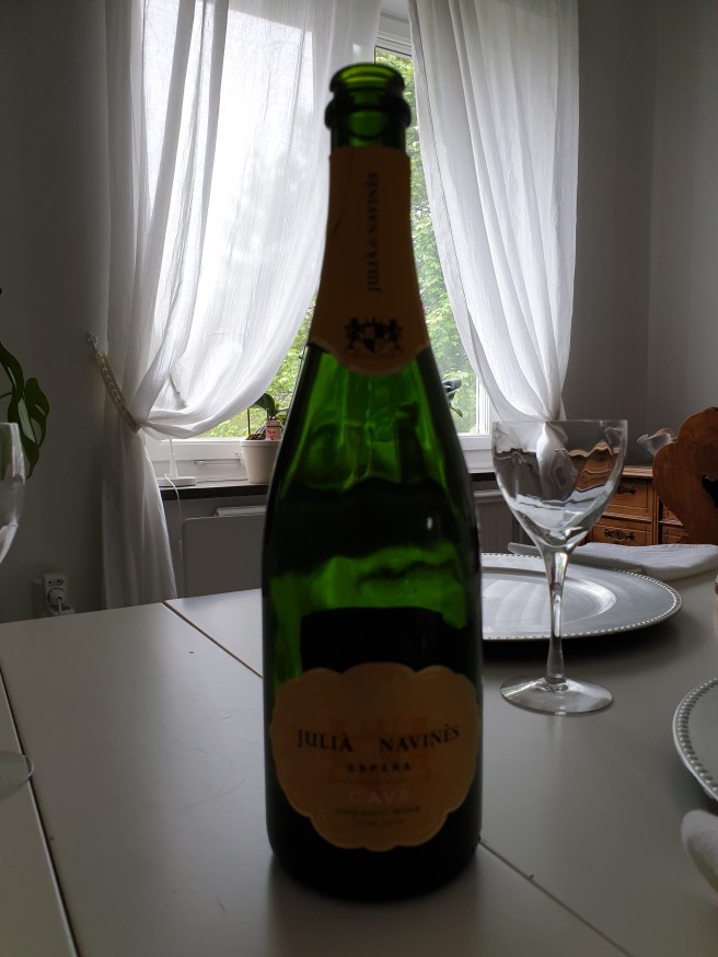 När vi babblat en stund alla 3 så satte vi oss till bords i ”matsalen”. Jag bjöd på tagliatelle med en sås med grönsaker och kräftstjärtar. Riktigt gott, faktiskt! Vi fortsatte dricka bubbel även till maten. Vi satt och pratade om allt mellan himmel och jord och åt tills vi var mätta.
