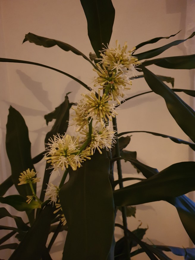 När jag kom hem så doftade det om möjligt ännu starkare hemma. Den blomman som stod i en vas hade börjat vissna. Och den som var kvar på dracenan hade slagit ut helt.