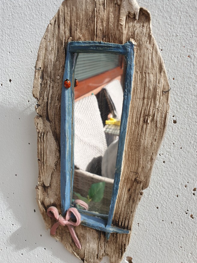 Vi fick sällskap av en nyckelpiga! Den satte sig så det såg ut som att den skulle vara där, att den hörde till ramen.