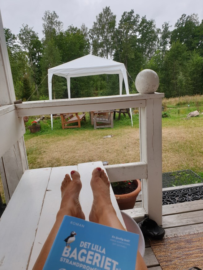 Idag är det grått och blåsigt, men jag sitter ändå ute på farstubron och läser.