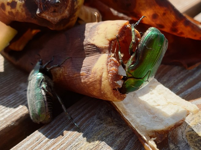 Hahaha!! Skalet hade legat framme i solen och blivit brunt. Efter att bananen var uppäten.