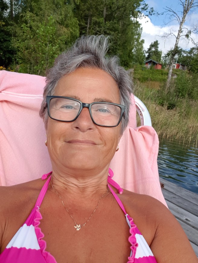 Anita skulle skruva bort hållarna till flytprylarna och plupp, så låg skruvdragaren i plurret. – Du ville bada, va, sa hon då. Så av med paltorna och i och fiska upp den! Hahaha!
