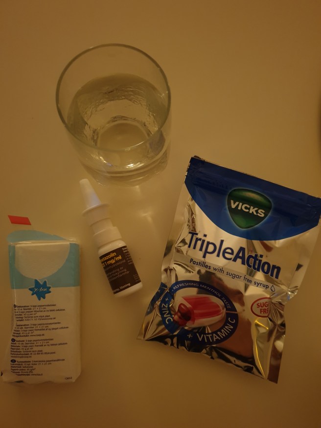 Så här var det framdukat på soffbordet igår. Ordnat för en riktig myskväll, eller hur?? Kan i alla fall tala om att den där nässprayen var superbra! Det var den billigaste, och den verkade på en gång och höll hela natten! Tycker jämt att man vaknar av att man är helt igenkorkad efter några timmar annars. Så det var skönt, att få sova ut.