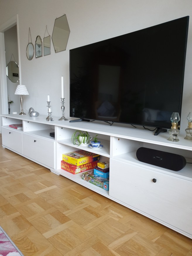 Jag plockade bort min gamla stereo och alla CD-skivor för ett tag sen. Jag har fått en…. Ja vad heter det? En högtalare som man kopplar till mobilen. I alla fall så fick jag den av Anita. Då blev det ett stort ”hål” i TV-bänken. Så jag fixade lite, och möblerade om med pryttlar så det ser fint ut.