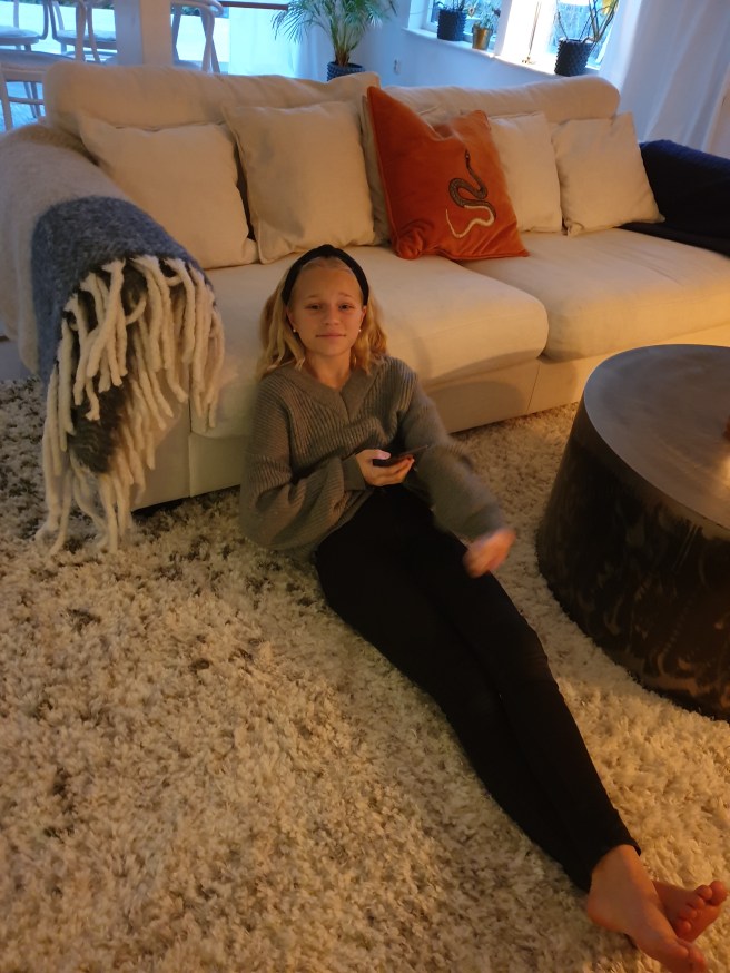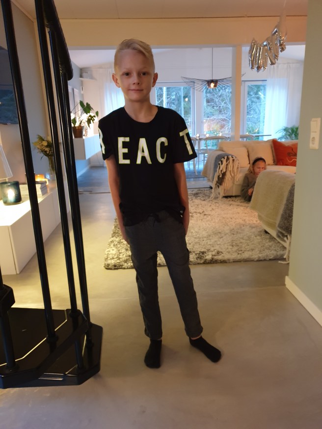 När han kramats länge, länge, när jag kom så tog han sitt paket och sprang upp till sitt rum och bytte om. Och han var så fin i sin nya outfit!