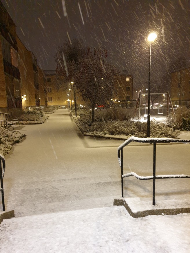 Jag har hört att de sagt att det ska komma snö. I helgen. Och helgen började tydligen redan i natt… Jag hade hoppats att det inte skulle komma snö just i Stockholm. Eller i alla fall inte i den del av Stockholm som jag bor i. Men jo då, det snöar, och måste ha gjort det hela natten. Och inte nog med att det snöar, det blåste rätt rejält oxå. Så mysigt att ge sig ut i!! INTE!!