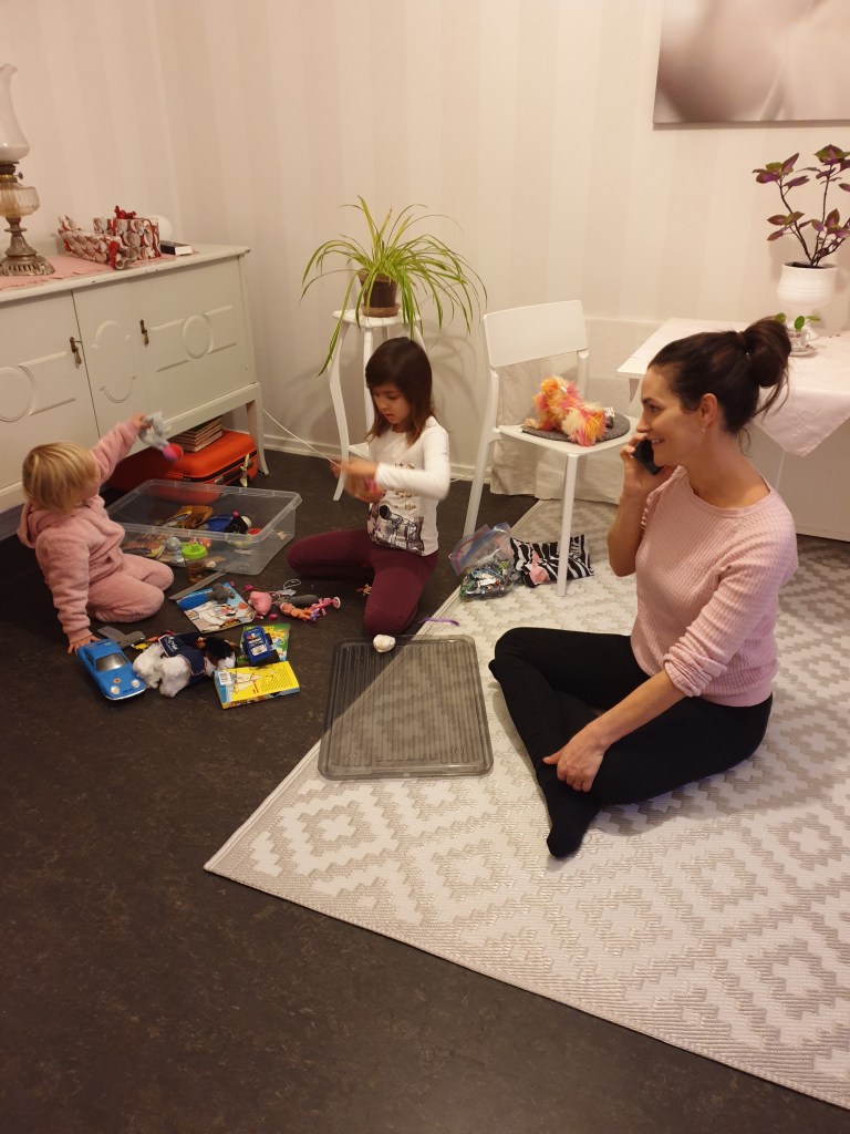 Tjejerna tog fram alla leksaker och Nettis pratade med mormor (Ja alltså, sin mamma. Den riktiga mamman, inte jag) i telefonen. Under tiden fixade jag fika och saft till oss.
