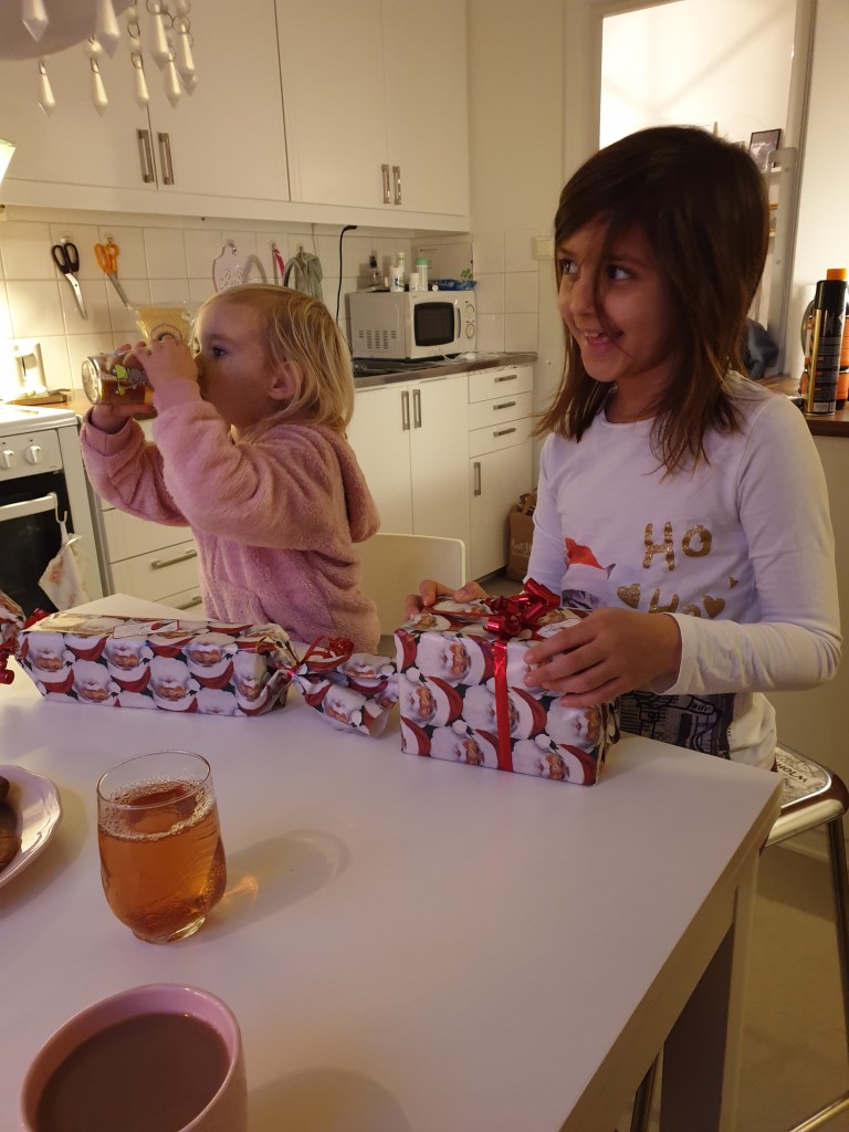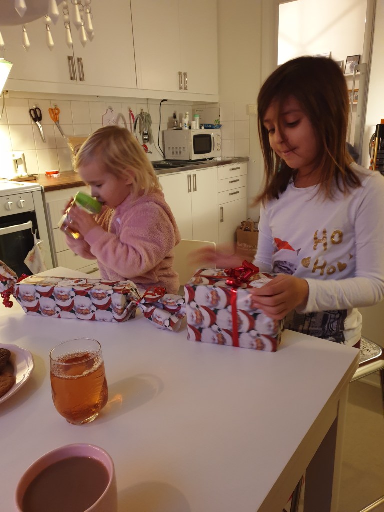 Tjejerna fick sina julklappar av mig, Korven fick playdoh och Bäbis 2 muggar med färgpennor som hon kan dekorera muggarna med och så härdar man dem i ugnen sen. Båda blev glada för sina klappar, så det var kul!!