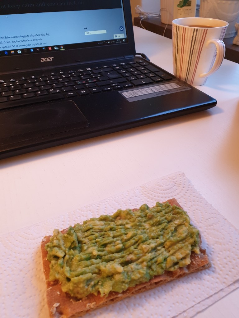 Söndag morgon, och nu, nu äntligen! Avokadomacka till frukost! Men va f*n då?! Det var en sån där supertrådig avokado. Lagom mogen, men hela var full av såna där tjocka, ganska hårda trådar. Blä! Tog nästa, och den var likadan. Så jag satt och pillade bort dem så gott det gick. Suck…