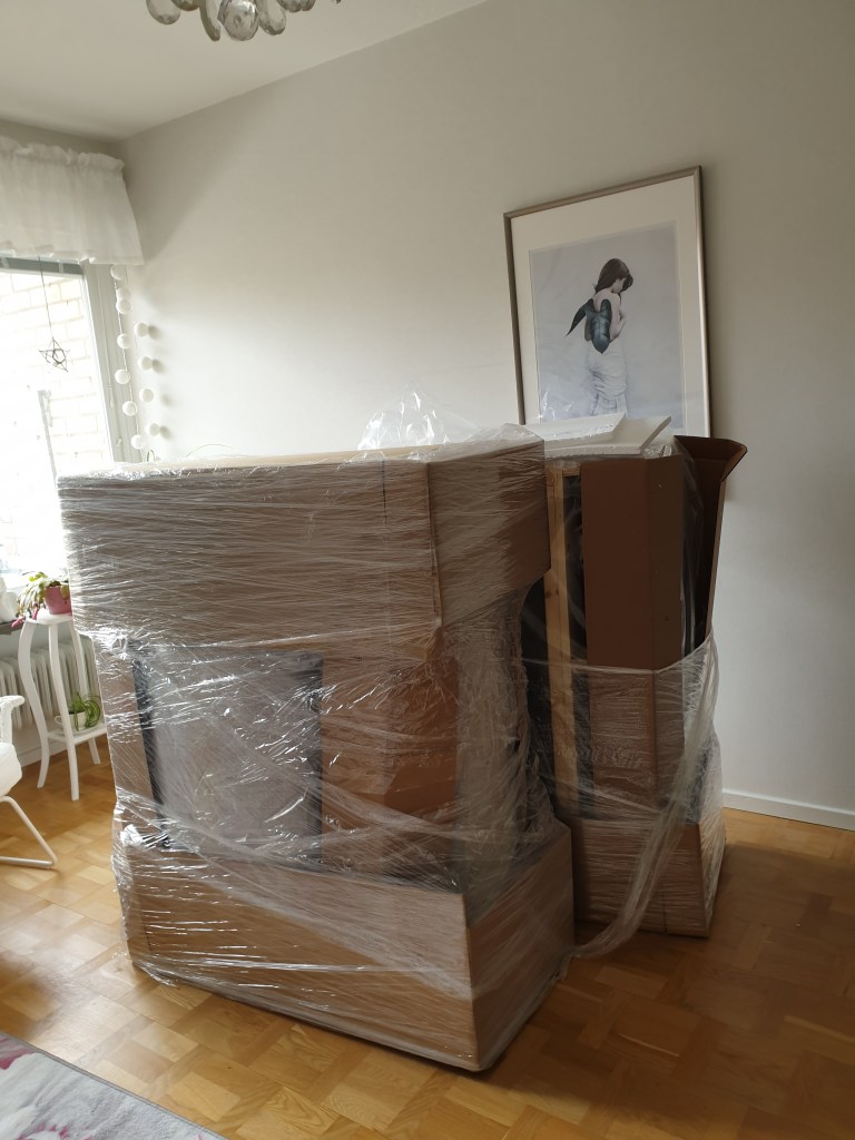 När arbetsdagen var slut satte jag igång och tog bort all plast och kartong från soffan. Och insåg att det var en miljard hål där man ska skruva fast benen… Och instruktionen var väääldigt dålig! Dessutom är den ju stor och bynglig, så det var ju inte helt lätt att få till ensam.
