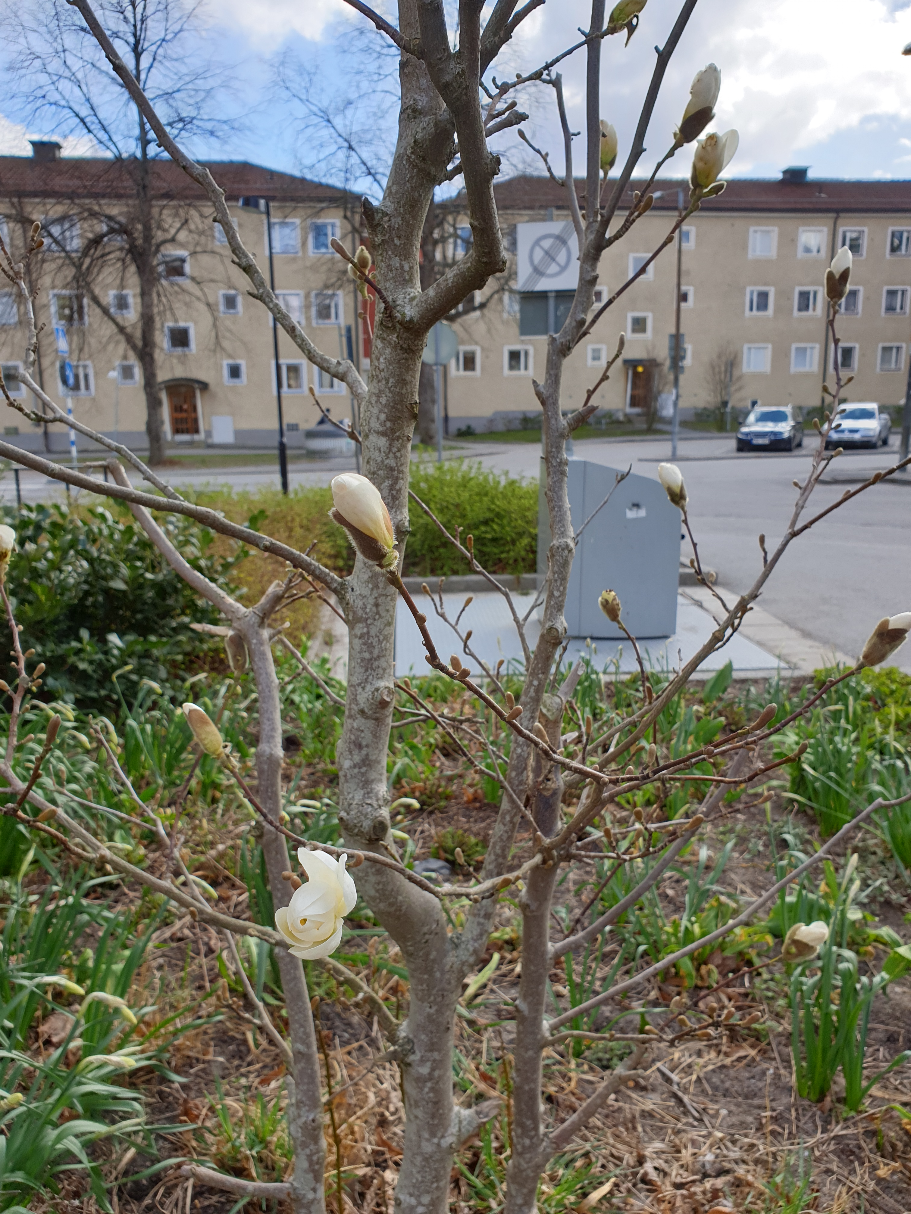 Magnolian på gården börjar blomma nu.