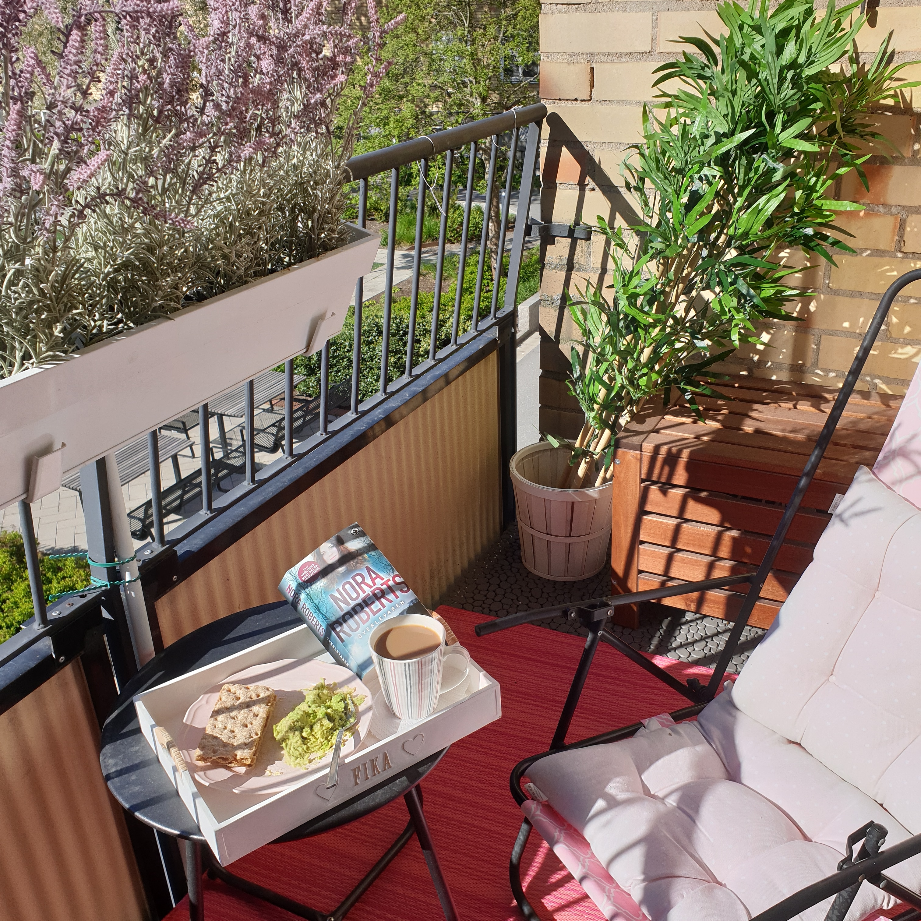 Vaknade vid 8 i morse och såg att solen sken. Gick ut och kände efter om det gick att sitta på balkongen, och det skulle nog gå.